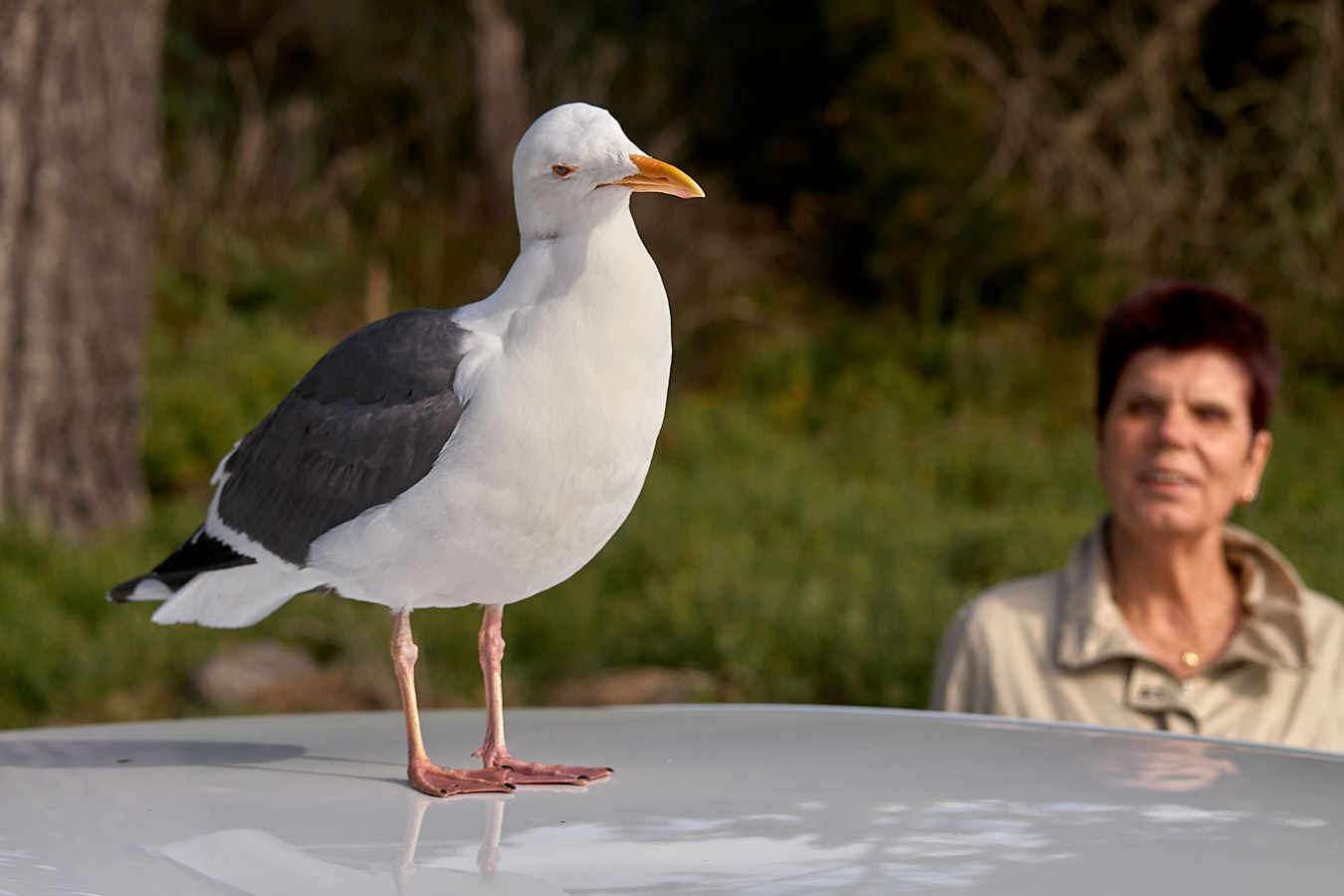 Selbst als wir uns ins Auto setzten und losfuhren, machte diese Möwe noch eine Weile auf Kühlerfigur. Erst als wir die Hauptstraße erreichten, flog sie wieder zum Parkplatz zurück.