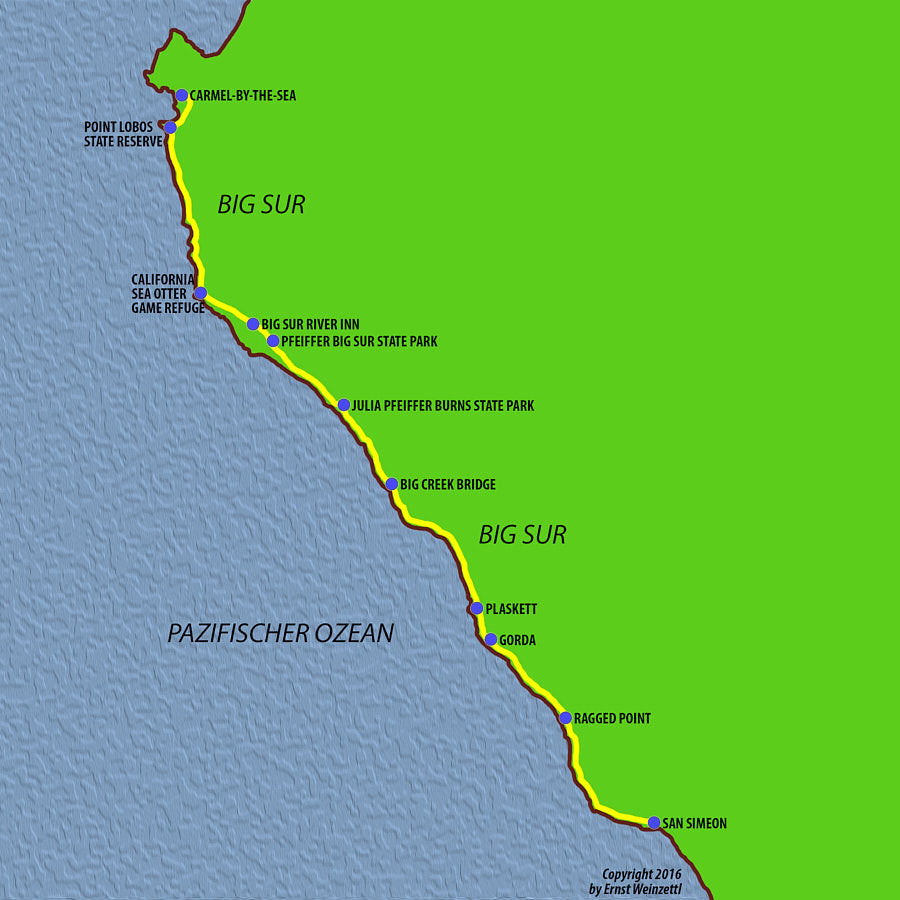 Big Sur reicht – je nachdem, welchen Einheimischen du fragst – entweder über die 120 km von Ragged Point oder von San Simeon im Süden über etwa 150 km jeweils bis zu Carmel-by-the-Sea im Norden. Auch die Quellen im Netz sind sich nicht einig über die Länge von Big Sur. Also sind wir das Problem anders angegangen:
