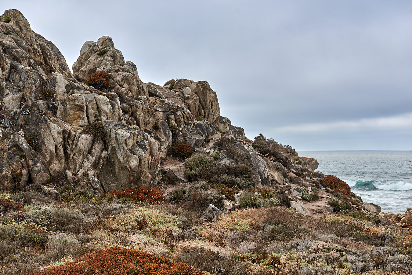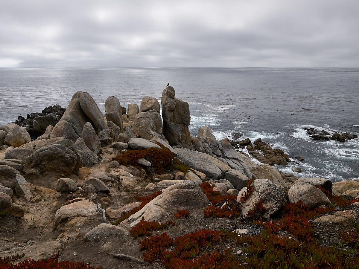 Der nördlichste Punkt der Carmel, ebenfalls mit abgestorbenen Zypressen in verschiedenen Stadien des Ausbleichens. Dazu noch Felsen, die hier aber rundgeschliffen und an der Landseite mit rostrotem Moos bewachsen sind.