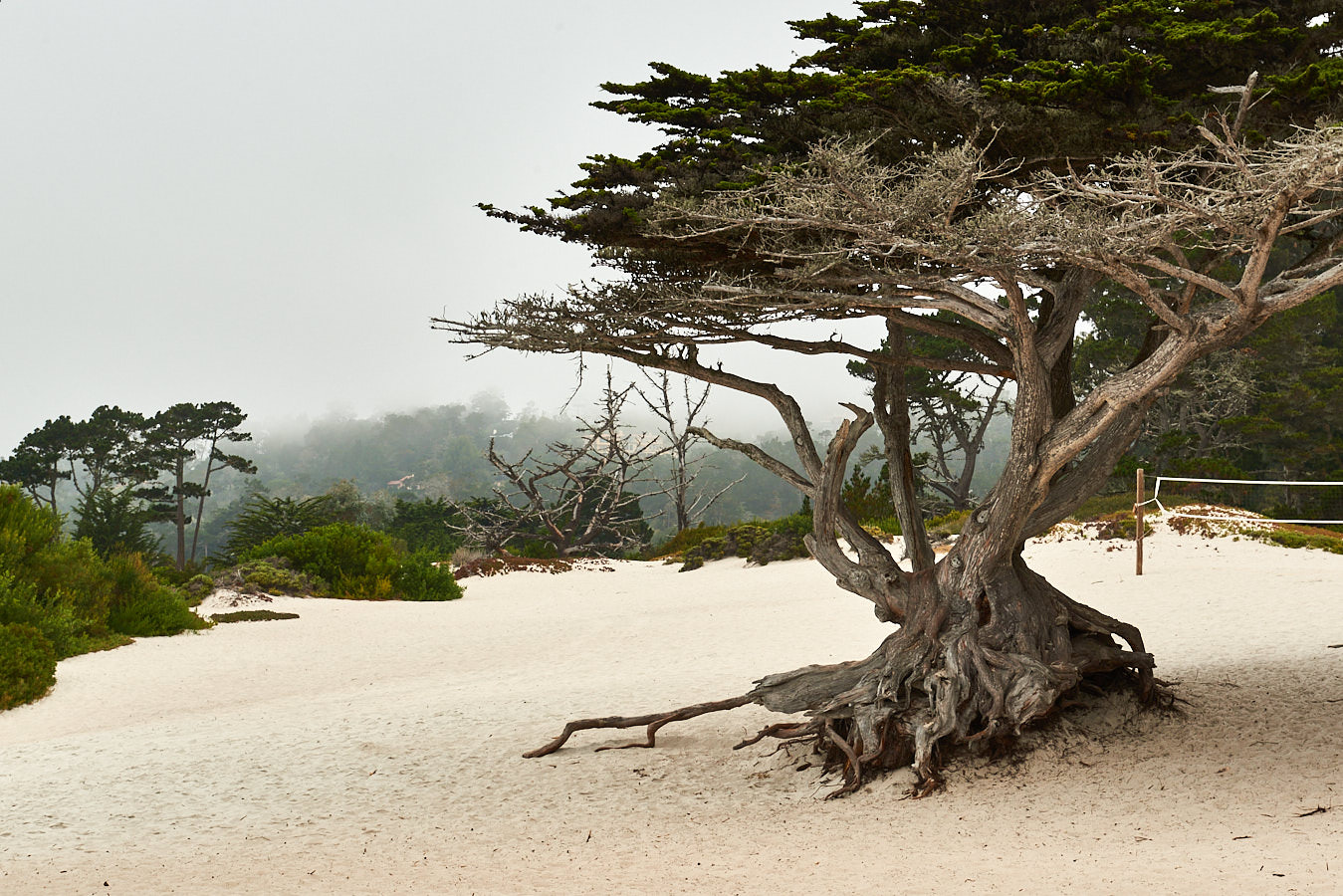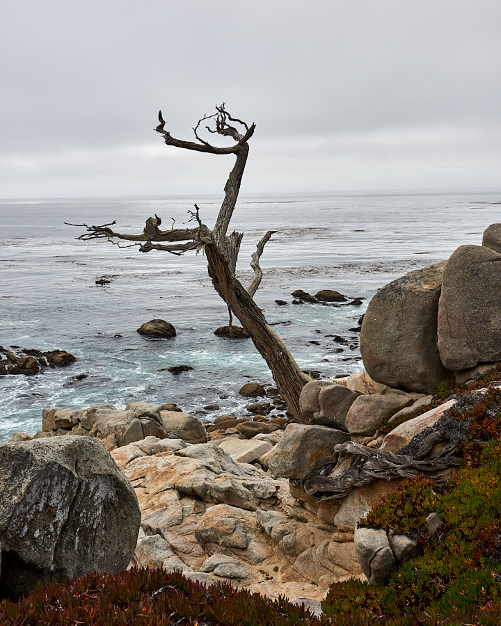 Diese vor vielen Jahren bereits abgestorbene Monterey Zypresse hat durch Witterungseinflüsse und Salzwasser einen mittlerweile fast weißen Stamm – auch wenn von diesem nicht mehr viel übrig ist. Der untere Stammrest bildet einen Durchgang, vor dem wir auch heute, wie in jedem Besuchsjahr, ein Foto machen. Unschwer zu erkennen, wann wir bei unseren Besuchen das mit Abstand beste Wetter hatten: